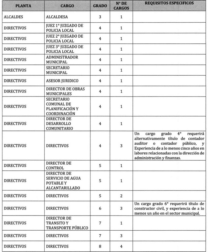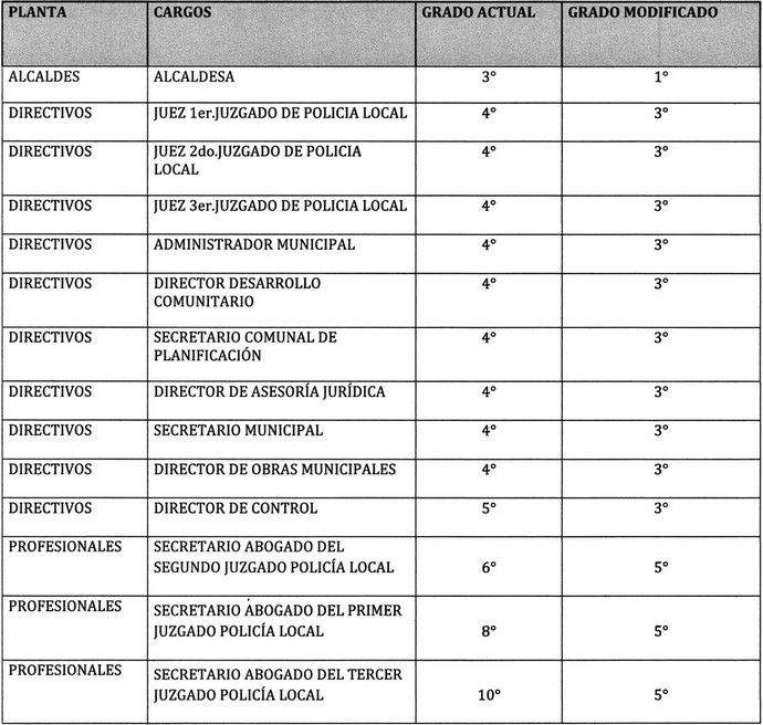 8) Conforme a las facultades que otorga la Ley N° 18.695 Orgánica Constitucional de Municipalidades; N° 15.231 sobre Organización y atribuciones de los Juzgados de Policía Local; y N° 19.602, Orgánica Constitucional de Municipalidades en materia de gestión municipal, y el decreto supremo N° 1.675/2017, que aprueba el Reglamento que regula el procedimiento para establecer la categoría en que se ubicarán las municipalidades del país para efectos de determinar el rango de grados que corresponde asignar al cargo de alcaldesa dentro de la planta municipal respectiva, se modifica el grado de la Alcaldesa de grado 3° a 1°, correspondiendo a su turno, la modificación de los grados de los cargos de Juez de Policía Local, Administrador Municipal y Directores de Secretaria Municipal, Control, Desarrollo Comunitario y Secretaria de Planificación y Coordinación, en la forma que se indica: