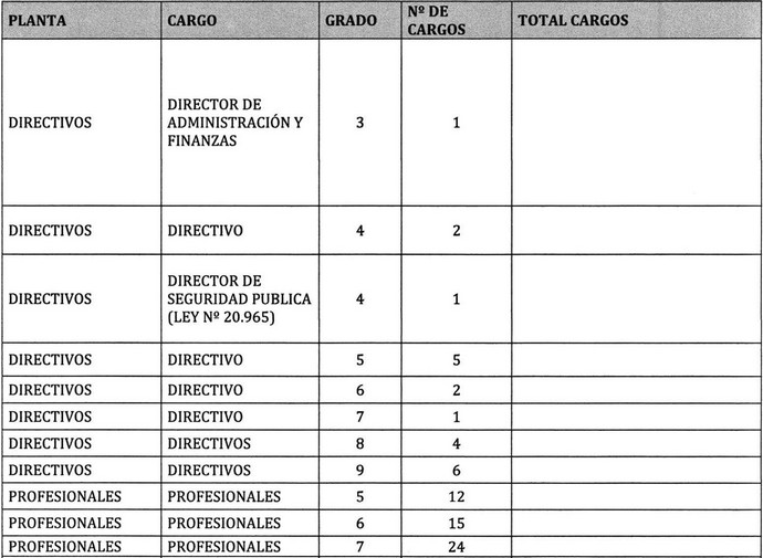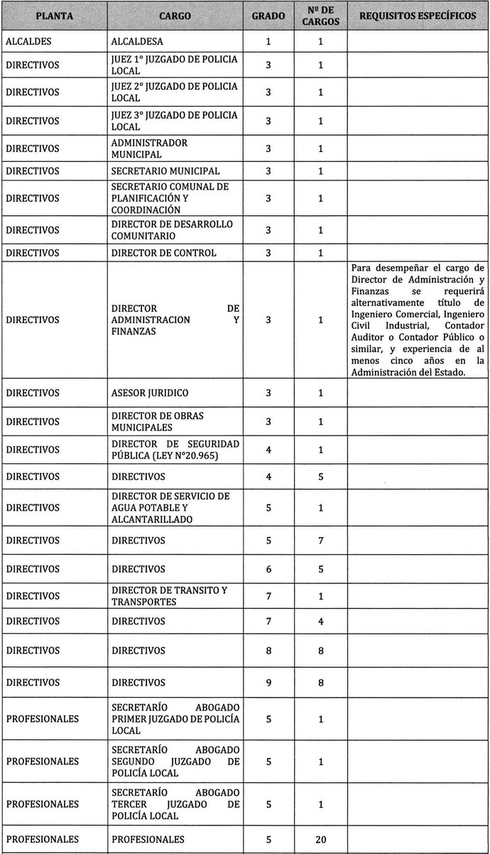 9) Con el fin de nominar aquellas plazas Directivas cuyas funciones hoy son desempeñadas por personal Directivo genérico, se crean los cargos de Director de Administración y Finanzas en grado 3°, de acuerdo a lo establecido en el artículo 16 de la Ley N° 18.695 Orgánica Constitucional de Municipalidades modificada por la ley N° 20.742, que perfecciona el rol fiscalizador del Concejo; fortalece la transparencia y probidad en las municipalidades, crea cargos y modifica normas sobre personal y finanzas municipales; y el Director de Seguridad Pública, en grado 5°, en virtud de la facultad establecida en el artículo 16 bis de la Ley N° 18.695 Orgánica Constitucional de Municipalidades modificada por la ley N° 20.965 que permite la creación de consejos y planes comunales de seguridad pública.