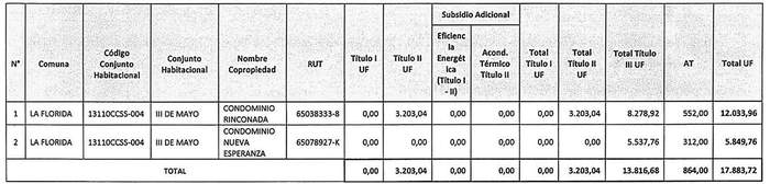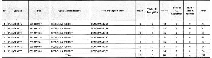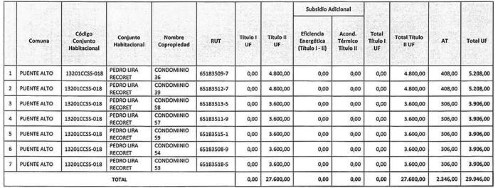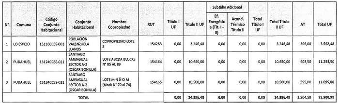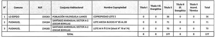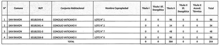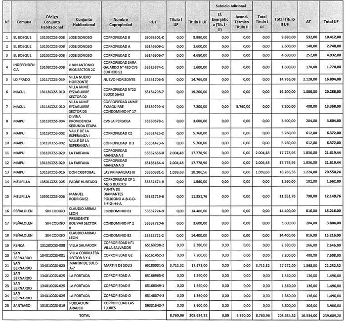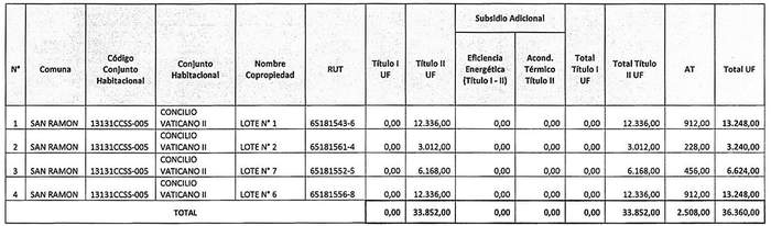La Resolución 986 Exenta, Vivienda, publicada el 13.08.2020, modifica la tabla inserta en el numeral numeral 1 de la presente norma denominada "Postulación Comunidad de Copropietarios", en el sentido de incrementar en montos para el Título II del proyecto "Nuevo Horizonte", de la comuna de Lo Prado, patrocinado por el PSAT P al Cubo y del proyecto "Copropiedad Nº 1 Villa El Salvador", comuna de Renca, patrocinado por el PSAT Asistec Nova, reemplazando los números 5 y 19 de por los que la citada norma indica.