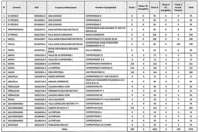 El numeral 1 de la Resolución 1195 Exenta, Vivienda, publicada el 14.10.2020, modifica el numeral 1 de la presente norma, en el sentido de incluir en la asignación las copropiedades: "MZ J Sitio 1" de la comuna de Cerrillos; "Condominio 4" de la comuna de Pudahuel y "Cop. Sitio 1 Manzana 58", de la comuna de Peñalolén, correspondientes al llamado 2019, para el desarrollo de proyectos en Condominios de Viviendas Sociales que conforman la Demanda General del programa, y Postulación Comunidad de Copropietarios. Asimismo, el numeral 2 de la citada Resolución dispone complementar en el resuelvo Nº 5 de esta norma, el número de postulantes seleccionados en la Región Metropolitana de la manera que la citada norma indica.