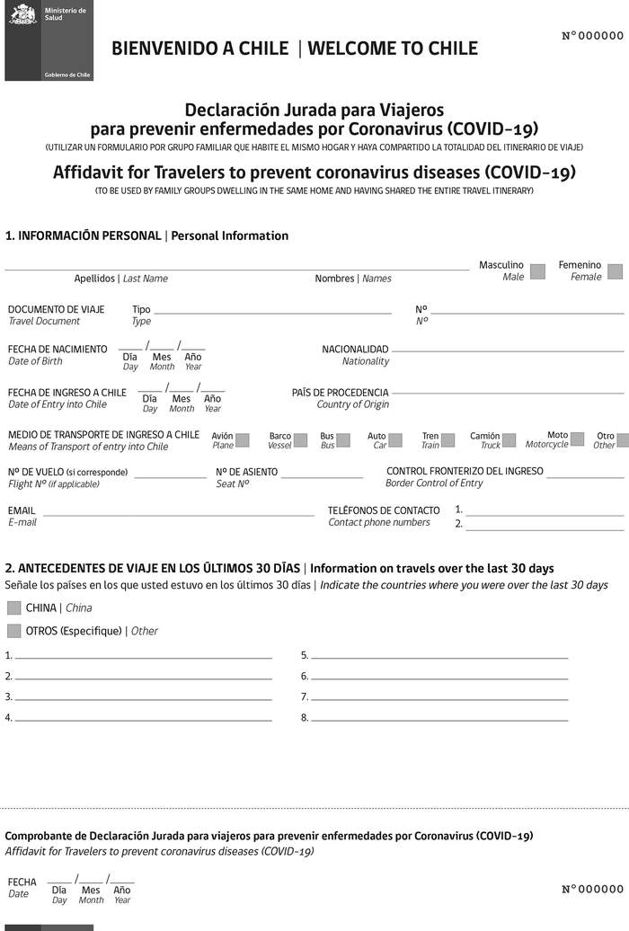 1º Establécese como medida de control sanitario ante la emergencia internacional producido por el nuevo coronavirus 2019, la obligatoriedad para todo viajero que ingrese al país, y cuyo destino final sea Chile, de realizar una declaración jurada respecto a su estado de salud. Esta declaración deberá completarse en la aeronave, nave o puerto fronterizo terrestre, según corresponda. Para ello, las naves y aeronaves deberán distribuir entre sus pasajeros el formulario del que trata esta resolución.