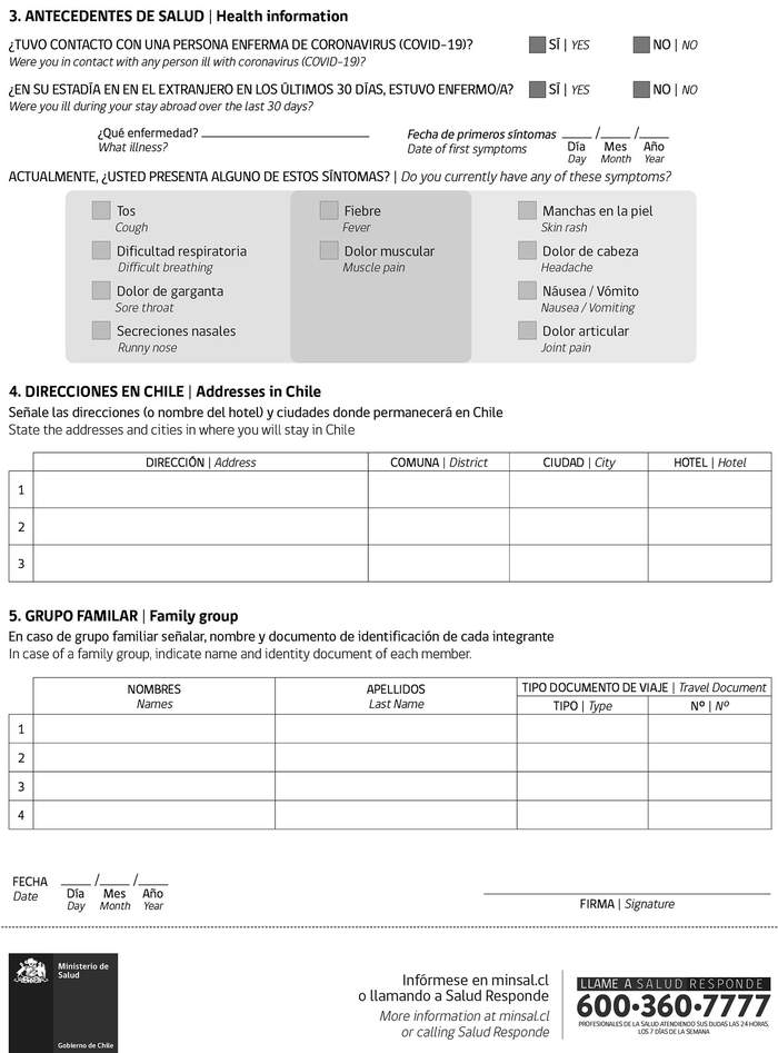 2º Apruébase el formulario para la "Declaración Jurada de estado de salud" para viajeros que ingresan a Chile, cuyo texto se acompaña la presente resolución y se entiende formar parte integrante de ella.