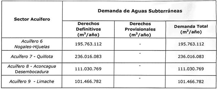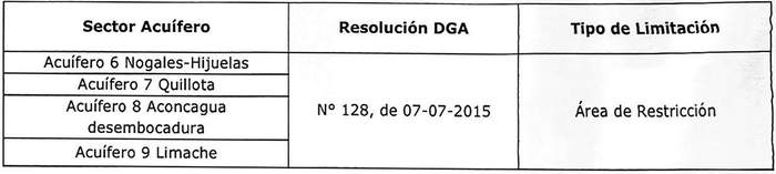 3.- Que, el Informe Técnico DARH Nº 264, de 18 de noviembre de 2019, denominado "Análisis de Disponibilidad de Aguas Subterráneas de los Sectores Acuíferos denominados Acuífero 6 Nogales-Hijuelas, Acuífero 7 Quillota, Acuífero 8 Aconcagua Desembocadura y Acuífero 9 Limache, ubicados en la Región de Valparaíso", del Departamento de Administración de Recursos Hídricos de la Dirección General de Aguas, señala que mediante resolución DGA Nº 128, de 7 de julio de 2015, basada en el Informe Técnico DARH Nº 163, SDT Nº 372, de julio de 2015, fueron declarados como área de restricción para nuevas extracciones de aguas subterráneas, los sectores acuíferos denominados Acuífero 6 Nogales-Hijuelas, Acuífero 7 Quillota, Acuífero 8 Aconcagua Desembocadura y Acuífero 9 Limache. En el mismo acto administrativo quedó establecido que, en dichos sectores, no era pertinente otorgar derechos de aprovechamiento de aguas subterráneas.