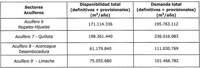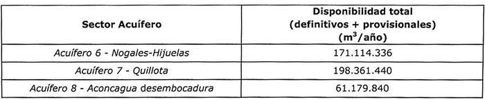 7.- Que, el referido informe dispone que, de acuerdo al Informe Técnico DARH Nº 333, SDT Nº 387, de 12 de octubre de 2016, del Departamento de Administración de Recursos Hídricos de la Dirección General de Aguas, denominado "Disponibilidad de Recursos Hídricos para el Otorgamiento de Derechos de Aprovechamiento de Aguas Subterráneas en el Valle del Aconcagua", se establece que en los sectores hidrogeológicos de aprovechamiento común denominados Acuífero 6 Nogales-Hijuelas, Acuífero 7 Quillota, Acuífero 8 Aconcagua Desembocadura y Acuífero 9 Limache, el volumen total factible de otorgar, como derechos definitivos y provisionales, son los indicados en la tabla siguiente: