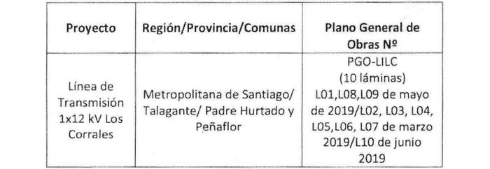 En su recorrido, la "Línea de Transmisión 1x12 kV Los Corrales" cruzará una línea eléctrica de distribución de 23 kV, de propiedad de CGE Distribución.