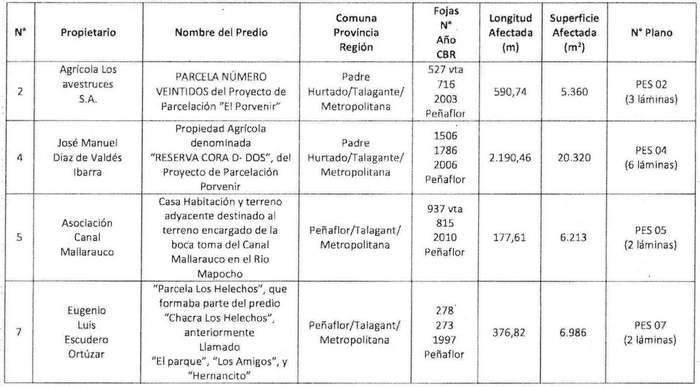 Artículo 7.- Constitúyanse, de acuerdo a lo que sobre el particular dispone la Ley General de Servicios Eléctricos, las servidumbres necesarias para el establecimiento de la "Línea de Transmisión 1x12 kV Los Corrales" en los inmuebles que a continuación se indican: