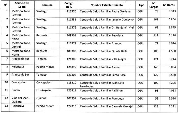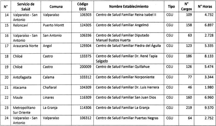 La letra c) del artículo 1 del Decreto 39, Salud, publicado el 07.02.2023, reemplaza el número de horas semanales correspondiente a los establecimientos urbanos de Atención Primaria de Salud Municipal que indica, contenidos en el presente artículo, de acuerdo a lo dispuesto en la tabla inserta de la citada norma.