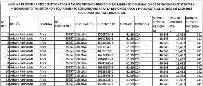 MODIFICA RESOLUCIÓN N° 2.093 EXENTA, DE FECHA 12 DE SEPTIEMBRE DE 2019, QUE LLAMA A POSTULACIÓN Y PROCESO DE SELECCIÓN REGIONAL EN CONDICIONES ESPECIALES PARA EL OTORGAMIENTO DE SUBSIDIOS HABITACIONALES DEL TÍTULO II, EN LA MODALIDAD DE, ENTRE OTRAS, PROYECTOS DE CONSTRUCCIÓN DE VIVIENDAS NUEVAS, DEL PROGRAMA DE HABITABILIDAD RURAL, REGULADO POR EL DS N° 10 (V. Y U.), DE 2015 Y SUS MODIFICACIONES, EN LA ALTERNATIVA DE POSTULACIÓN INDIVIDUAL O COLECTIVA DE LA REGIÓN DE ARICA Y PARINACOTA Y APRUEBA NÓMINA DE SELECCIONADOS
