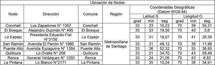 2. Autorízase a la concesionaria para instalar, operar y explotar, ocho (8) Nodos Ópticos en las comunas de Conchalí, El Bosque, Lo Espejo, San Ramón, Puente Alto, Quilicura, Renca y La Pintana, en la Región Metropolitana de Santiago, cuyas ubicaciones se indican a continuación: