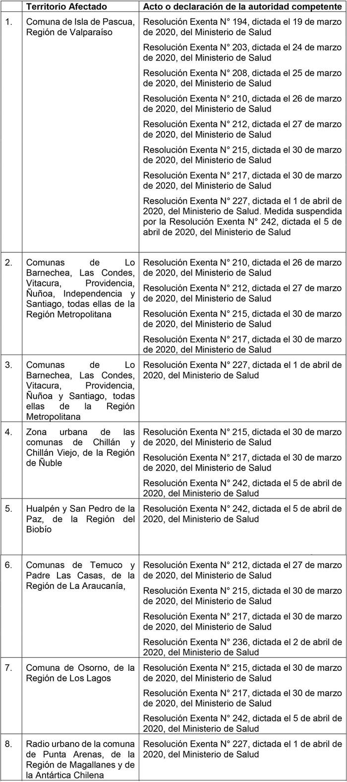 Primero.- Señálanse las siguientes zonas o territorios afectados por los actos de autoridad que se individualizan a continuación y que implican la paralización total o parcial de actividades en todo o parte del territorio, impidiéndose o prohibiéndose totalmente la prestación de los servicios contratados, para efectos de acceder a las prestaciones señaladas en los artículos 1 y 2 de la ley N° 21.227, respecto de los trabajadores afiliados al Seguro de Desempleo de la ley N° 19.728: