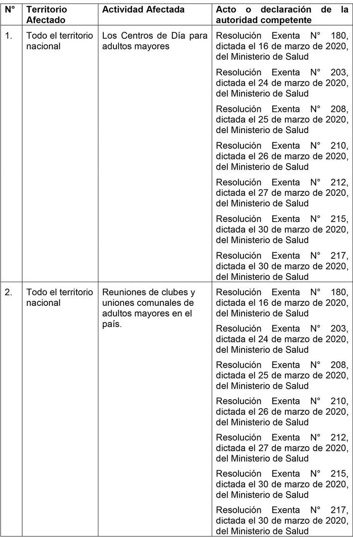 SEÑÁLANSE LAS ZONAS O TERRITORIOS AFECTADOS POR ACTO O DECLARACIÓN DE AUTORIDAD Y LAS ACTIVIDADES O ESTABLECIMIENTOS EXCEPTUADOS DE LA PARALIZACIÓN DE ACTIVIDADES, PARA EFECTOS DE ACCEDER A LAS PRESTACIONES A QUE SE REFIEREN LOS ARTÍCULOS 1 Y 2 DE LA LEY N° 21.227