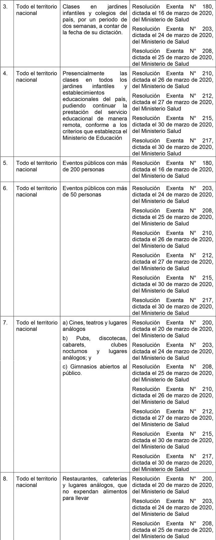 2) Que, con fecha 16 de marzo de 2020, se dictó el decreto supremo N° 102, del Ministerio del Interior y Seguridad Pública, que dispuso, a contar de las 00:00 horas del miércoles 18 de marzo de 2020, el cierre para el tránsito de personas, de todos los lugares habilitados para el tránsito de extranjeros hacia el territorio nacional, medida que rigió por un plazo de 15 días desde la fecha ahí señalada. Mediante decreto supremo Nº 116, de 2020, del Ministerio del Interior y Seguridad Pública, se extendió la vigencia del referido decreto supremo N° 102, de 2020, por un lapso de 7 días.