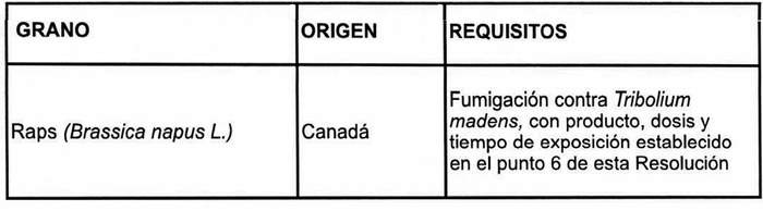 1. Agrégase en el resuelvo número 3, para la especie "Raps (Brassica napus L.)", el siguiente origen, en orden alfabético, y su requisito que se indican a continuación: