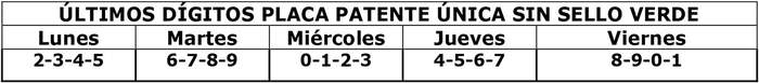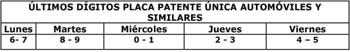 b) Automóviles, station wagons y similares, sin sello verde, motocicletas y similares de años anteriores al año 2002; fuera del perímetro delimitado por el anillo Américo Vespucio, pero dentro de la provincia de Santiago y comunas de San Bernardo y Puente Alto, de lunes a viernes, excepto festivos, entre las 7:30 y las 21:00 horas, según su último dígito de placa patente, conforme el siguiente calendario semanal: