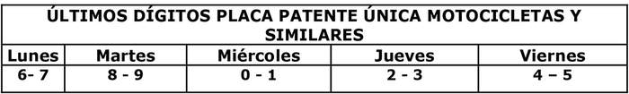 f) Motocicletas y similares, inscritos en el Registro Nacional de Vehículos Motorizados antes del 1 de septiembre de 2010; de lunes a viernes, excepto festivos, entre las 7:30 y las 21:00 horas, al interior del perímetro delimitado por el anillo Américo Vespucio, según su último dígito de placa patente, conforme al siguiente calendario: