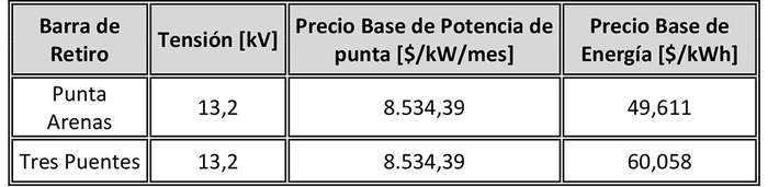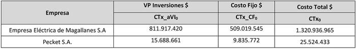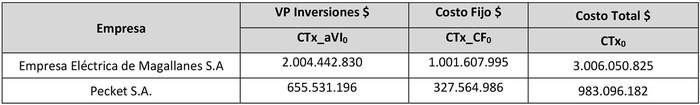 Por último, los costos de transmisión determinados a partir de la anualidad de la inversión y de los costos de operación, mantenimiento y administración de las empresas propietarias de instalaciones de transmisión que operan el Sistema Mediano de Punta Arenas, considerados en la determinación de la tarifa, son los que se presentan a continuación: