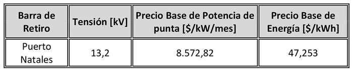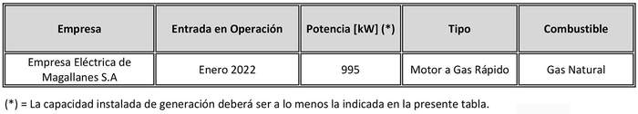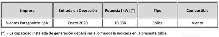 Para el Sistema de Punta Arenas, la siguiente empresa será responsable de la ejecución y construcción de la obra de generación que a continuación se indica: