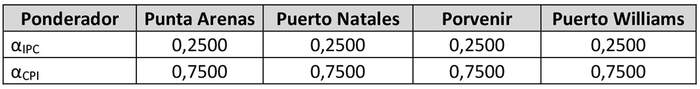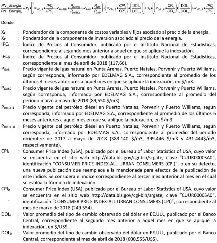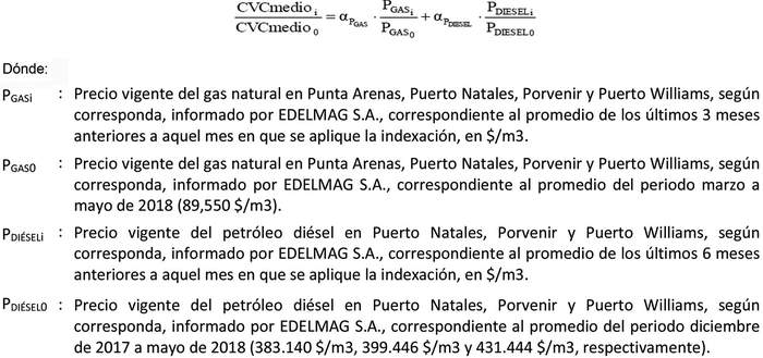 Las fórmulas de indexación aplicables a los precios de nudo en las barras de retiro de los Sistemas Medianos de Punta Arenas, Puerto Natales, Porvenir y Puerto Williams, son las siguientes.