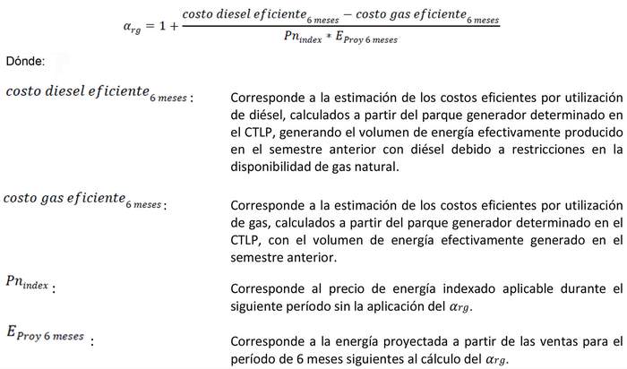 El parámetro arg se define como el coeficiente que multiplica el precio de la energía base para incorporar la desviación que se haya presentado en los costos eficientes de generación debido al despacho de centrales diésel, gatillado por una restricción en el suministro de gas.