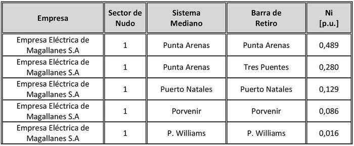 A continuación se indican los valores del parámetro Ni en cada una de las barras de retiro consideradas para efectos de representar los costos de generación-transporte en su estructura de precios a nivel de distribución.