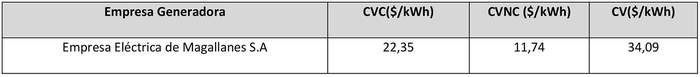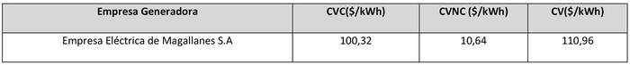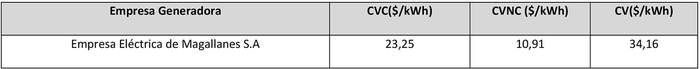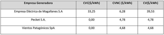 Para efectos de la repartición de la recaudación por venta de energía y potencia a clientes regulados, el costo variable de cada empresa generadora de los Sistemas Medianos de Punta Arenas, Puerto Natales, Porvenir y Puerto Williams, correspondiente al promedio ponderado por generación esperada de los costos variables unitarios de generación, combustibles y no combustibles, considerados en la determinación de tarifas de aquellas unidades de generación asignables a cada empresa, son los que se detallan a continuación: