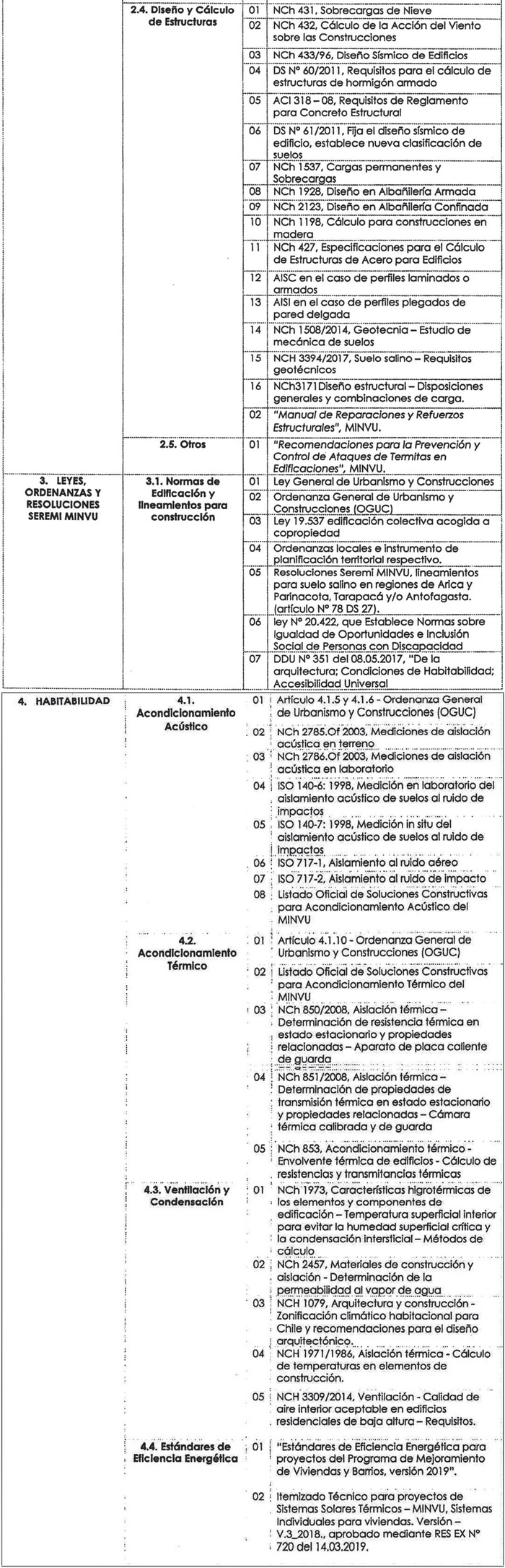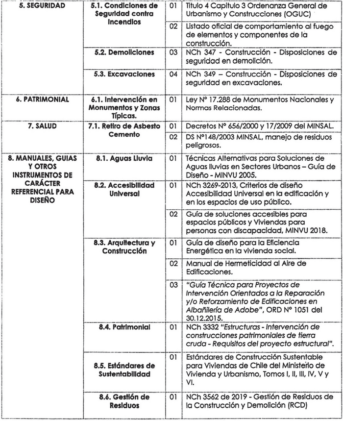 Se entrega un listado, no taxativo, de las distintas normas, manuales y guías que conforman el marco normativo mínimo para el diseño y posterior ejecución de los proyectos que se rigen por el D.S. 27 y sus modificaciones.