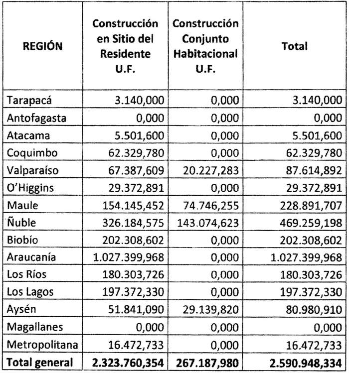 "Los recursos involucrados para la selección de postulantes al presente Llamado, ascienden a un total de 2.590.948,334 UF, y su distribución regional, según tipología, será la siguiente":