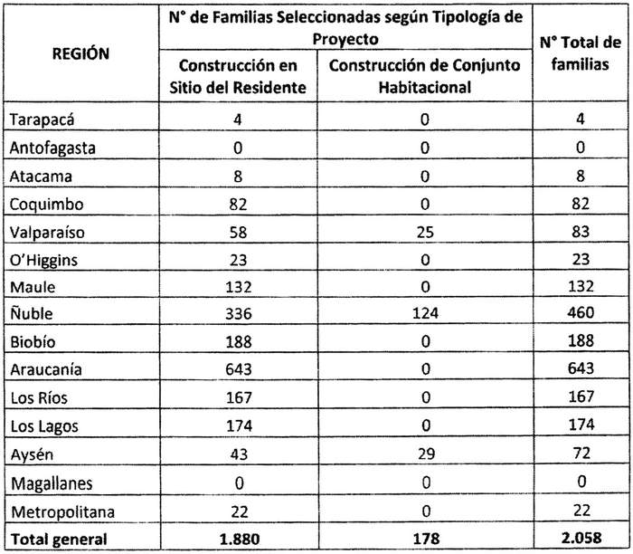 2. Apruébanse las nóminas de postulantes seleccionados para el otorgamiento de subsidios habitacionales, correspondientes al segundo cierre de postulación del Llamado en Condiciones Especiales de 2019, del Programa de Habitabilidad Rural en su Título II, Modalidades Vivienda Nueva, regulado mediante la resolución exenta N° 1.636 (V. y U.) de 2019, y sus modificaciones, las que se adjuntan a la presente resolución y se entienden formar parte íntegra de esta. Además, fíjase el número de postulantes seleccionados por Región y tipología de proyecto, según se indica en la siguiente tabla: