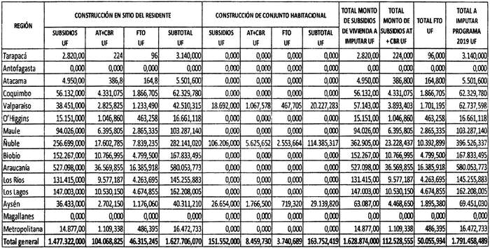 5. Impútese el monto total de 1.791.458,489 Unidades de Fomento, señaladas en el cuadro inserto en el resuelvo 3. de la presente resolución, a los recursos destinados en la resolución exenta N° 152 (V. y U.), de 2019, y sus modificaciones, al Programa de Habitabilidad Rural correspondiente al año 2019.