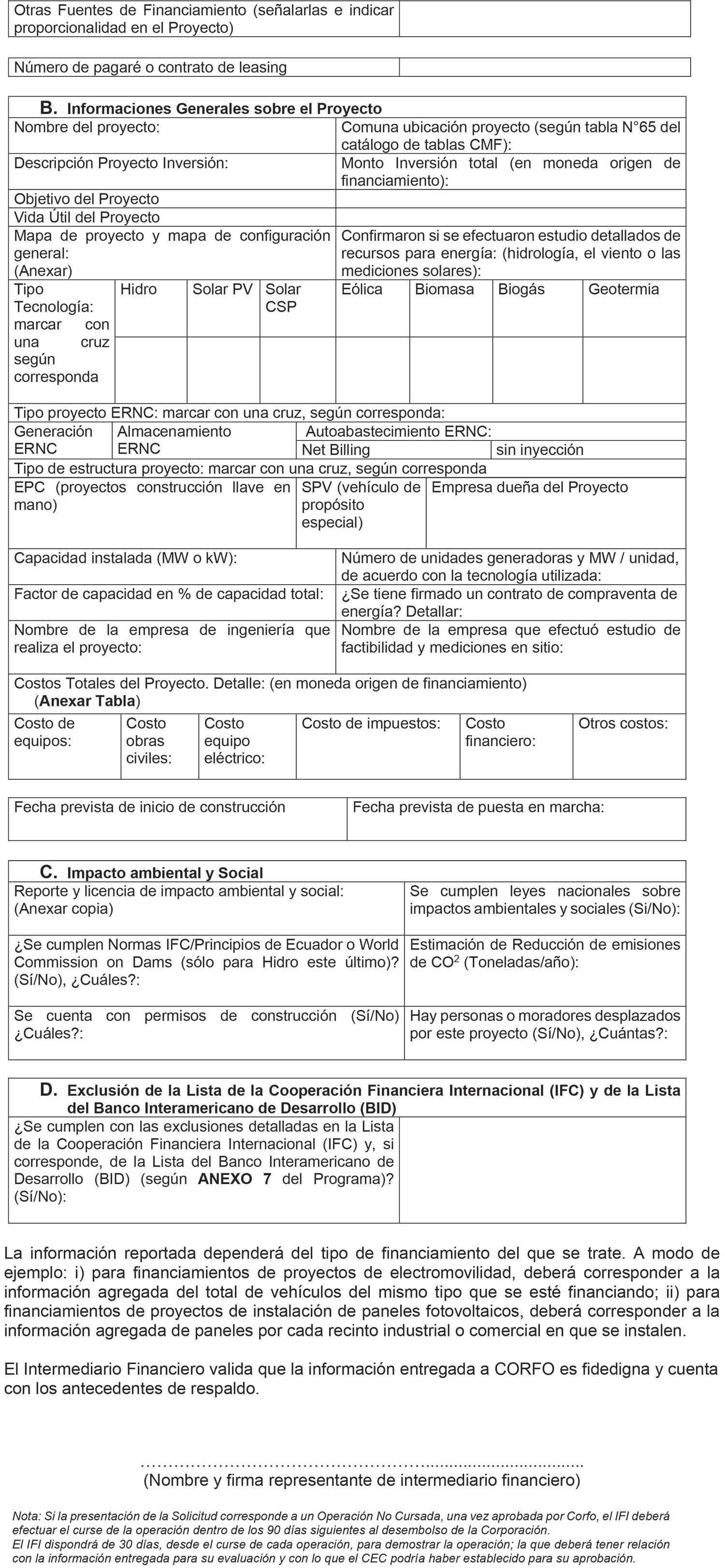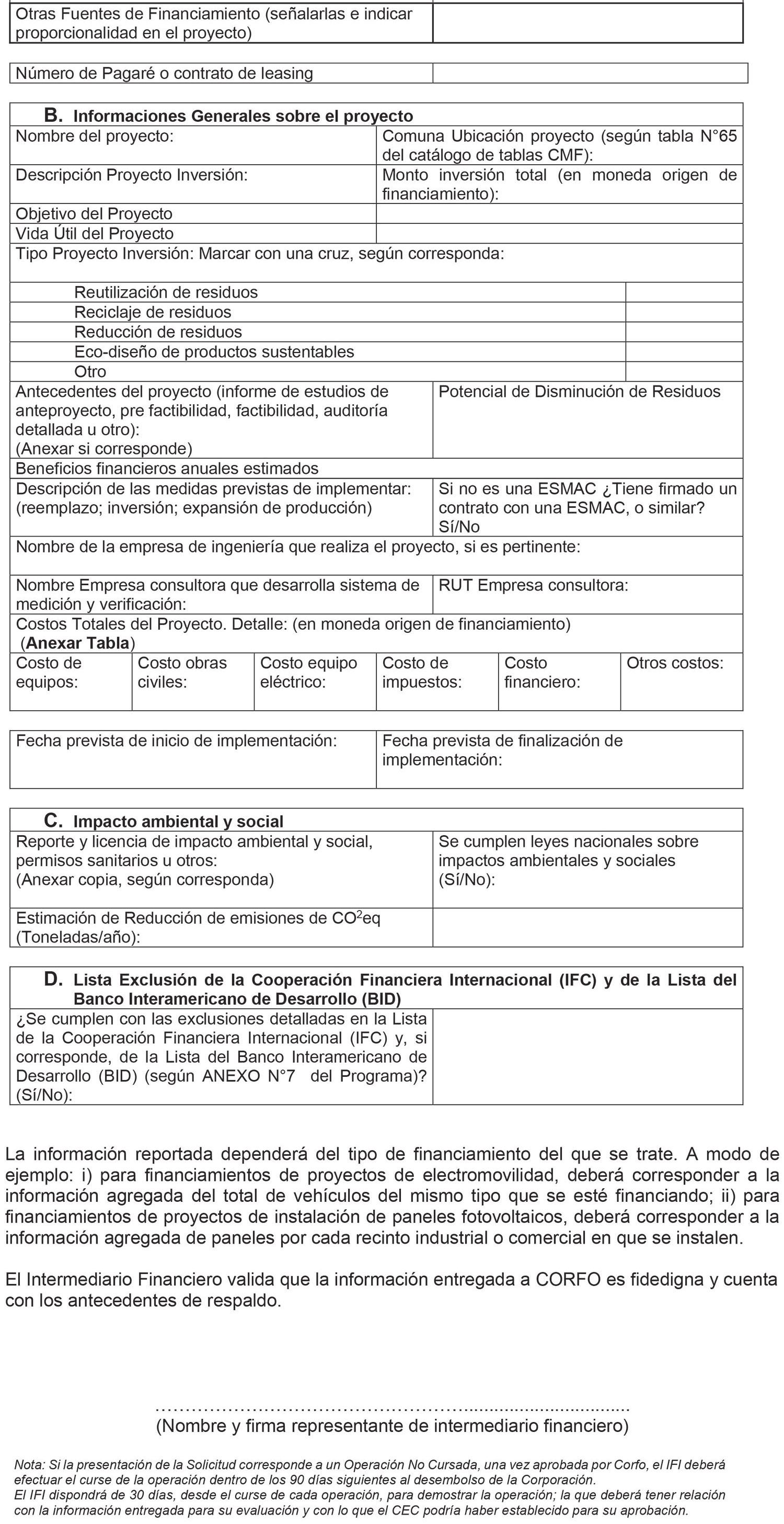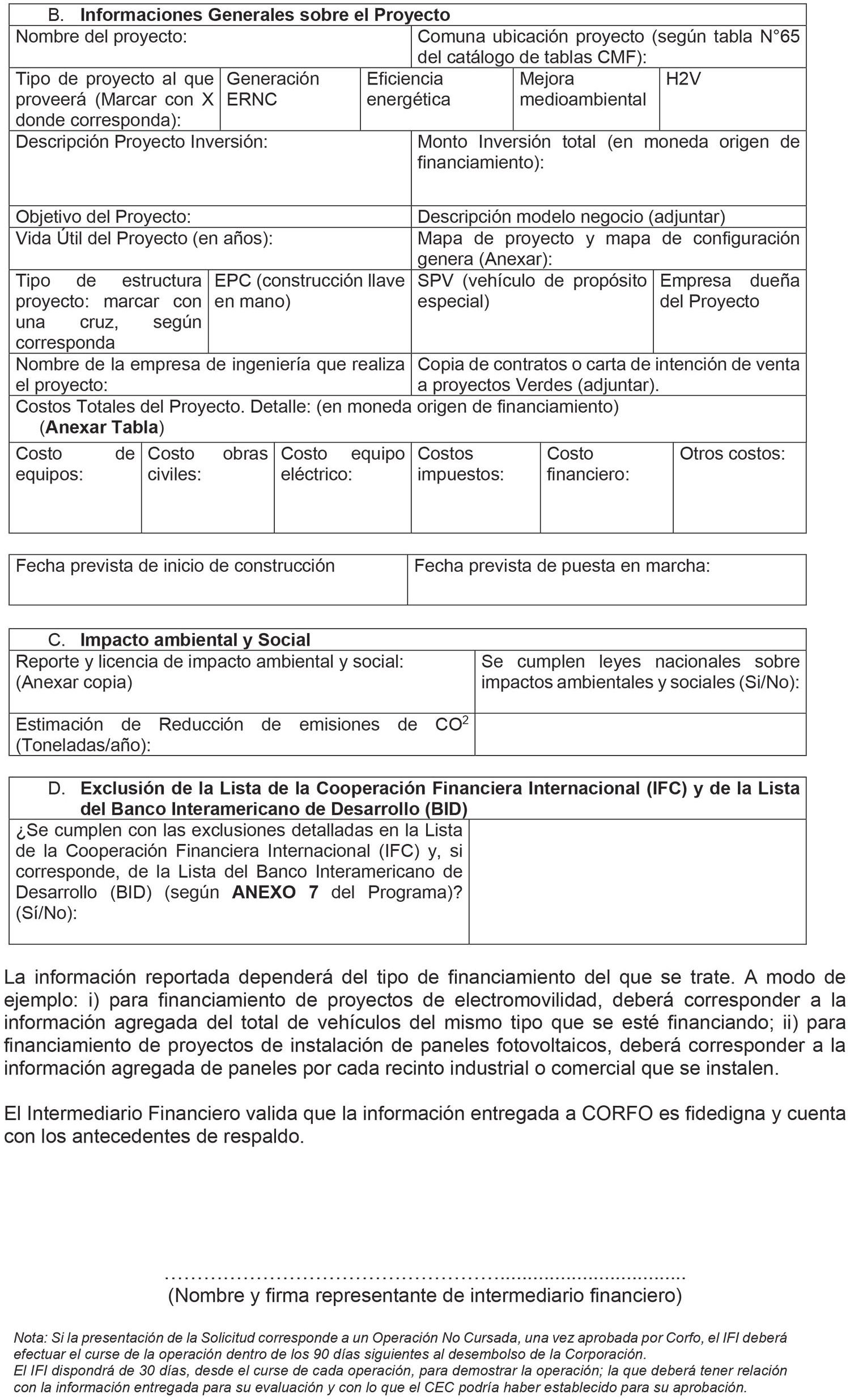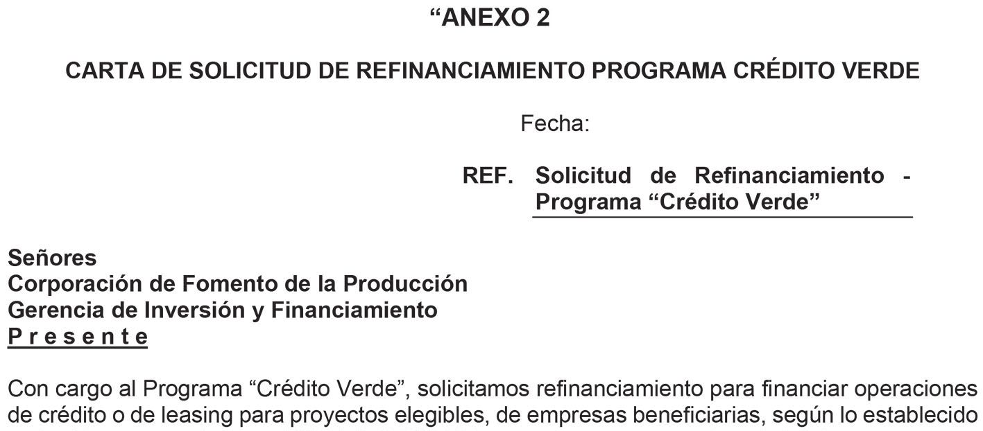 D.O. 09.12.2024 programa "Crédito Verde" (en adelante indistintamente el "Programa") tiene por objeto el refinanciamiento de créditos de largo plazo que otorguen los intermediarios financieros para las inversiones que realicen las empresas privadas para proyectos destinados a (i) generación y/o almacenamiento de energías renovables no convencionales (ERNC), incluyendo proyectos para autoabastecimiento de empresas; (ii) Eficiencia energética (EE) relacionados con la optimización del uso energético y la reducción de costos asociados al uso de la energía en empresas; y (iii) medidas de mejora medio ambiental en procesos productivos, dentro de lo que se encuentran comprendidas las iniciativas de economía circular; (iv) desarrollo de la industria de hidrógeno verde; y (v) inversión en plantas de fabricación y de ensamblaje de componentes, y de fabricación y ensamblaje de bienes finales, destinados a los proyectos de inversión indicados en este numeral. En el caso de los proyectos de hidrógeno verde definidos en el (iv) anterior, el objeto del refinanciamiento podrá también cubrir el costo de estudios de preinversión que hubieran efectuado los proyectos.