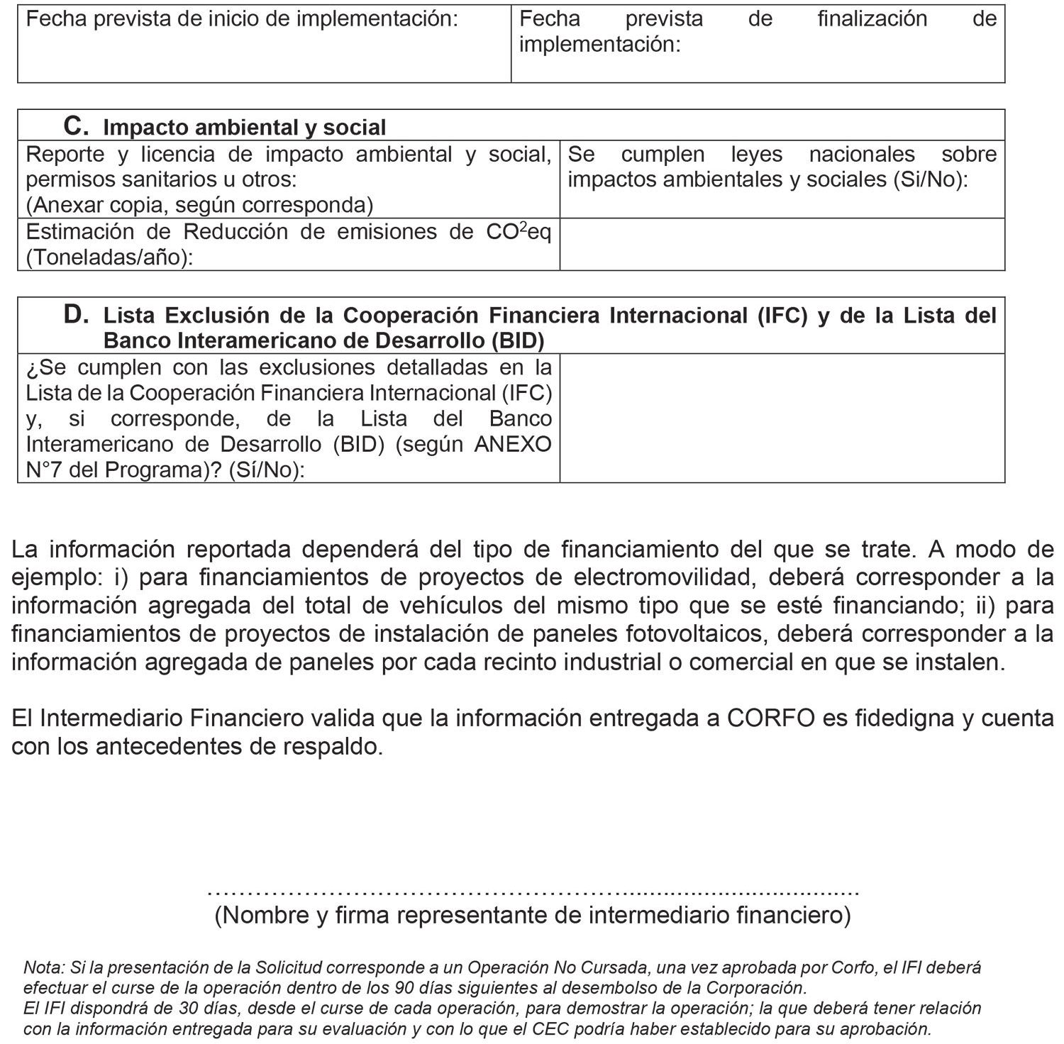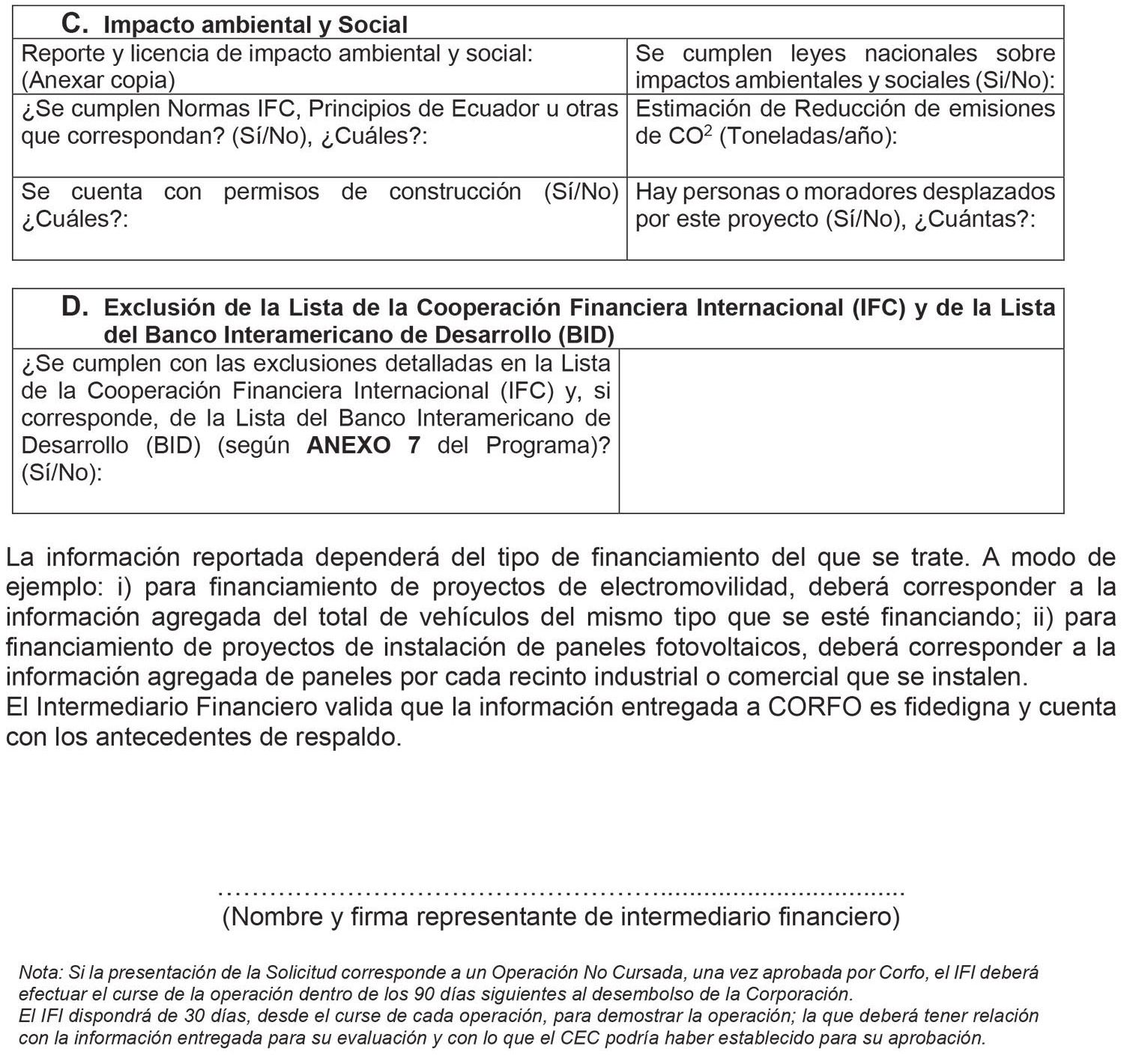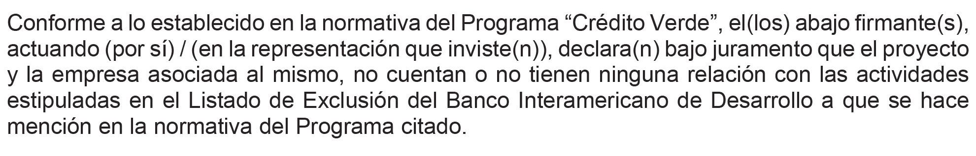 Conforme a lo establecido en la normativa del Programa "Crédito Verde", el(los) abajo firmante(s), actuando (por sí) / (en la representación que inviste(n)), declara(n) bajo juramento que el proyecto y la empresa asociada al mismo, no cuentan o no tienen ninguna relación con las actividades estipuladas en el Listado de Exclusión de la Cooperación Financiera Internacional a que se hace mención en la normativa del Programa citado.