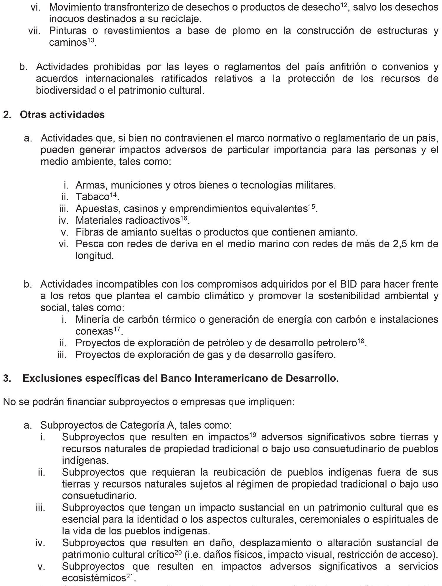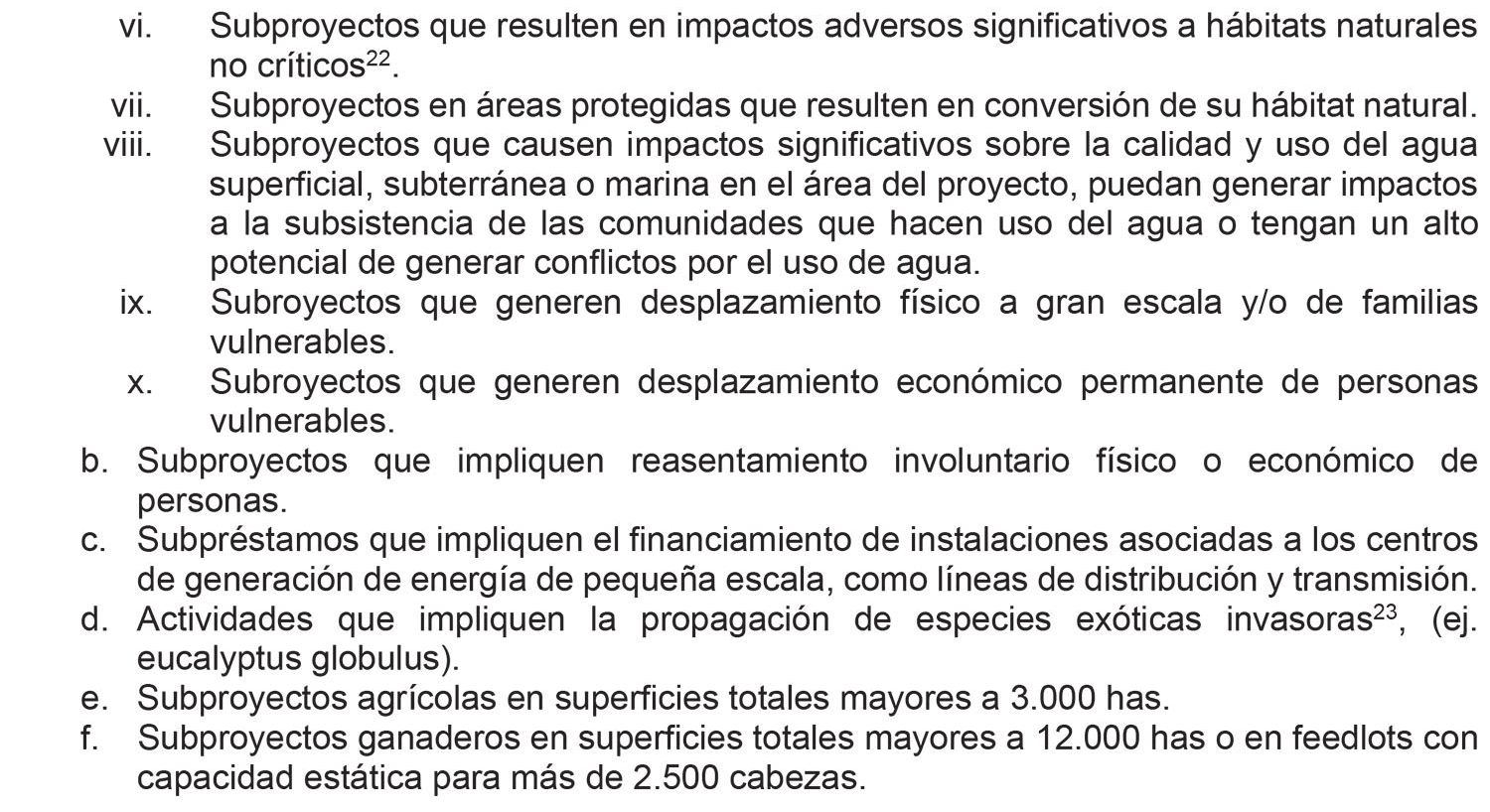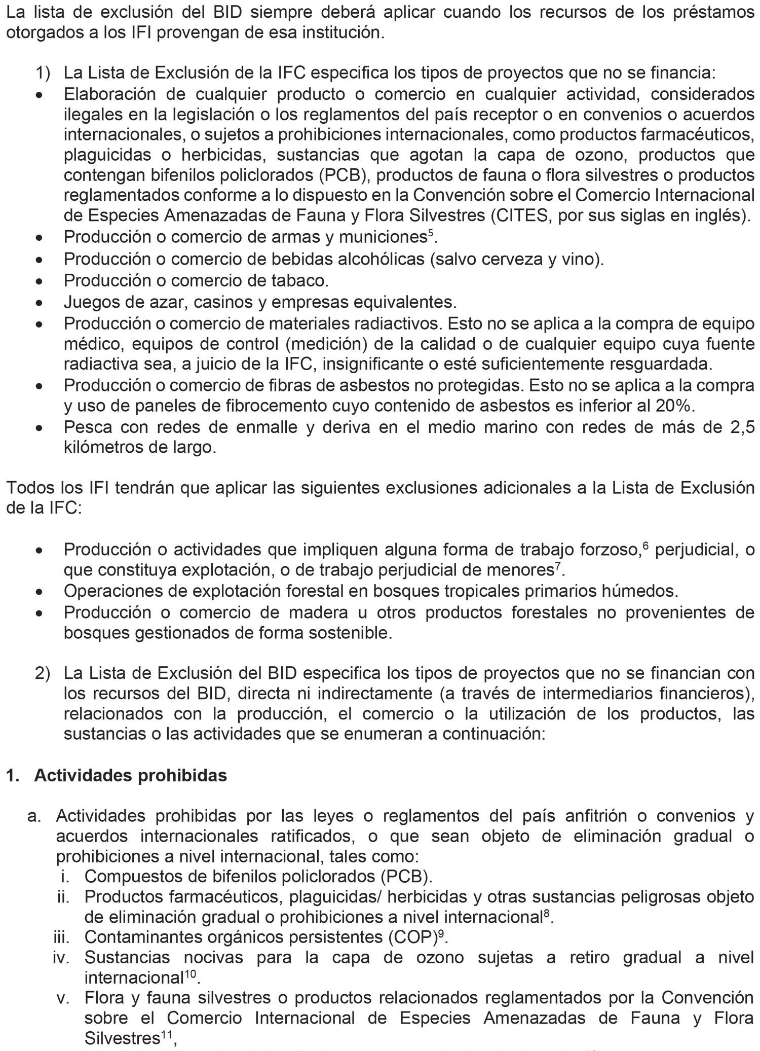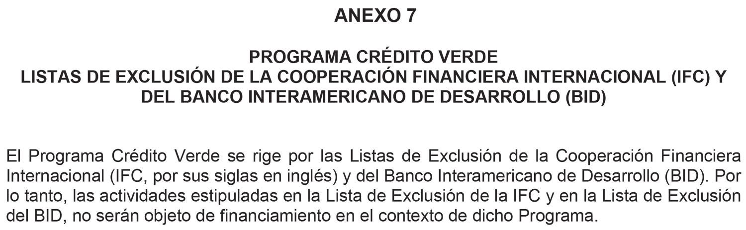 Los recursos de este Programa están sujetos a su disponibilidad presupuestaria para cada año, incluyendo los recursos correspondientes a préstamos u otros apoyos otorgados por bancos o entidades de desarrollo internacionales en la medida que los proyectos cumplan con las exigencias que éstos establezcan, en particular, sus estándares medioambientales y sociales, dentro de los cuales están los estándares del IFC y del Banco Interamericano de Desarrollo, cuyas listas de exclusión están indicadas en el Anexo 7 de estas Normas.