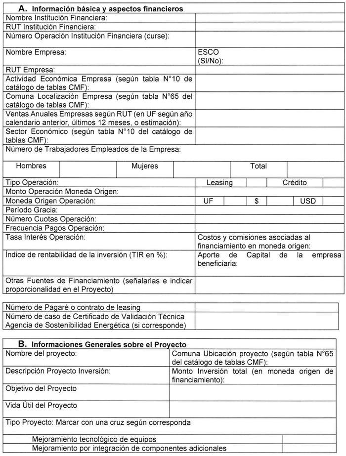 La información reportada dependerá del tipo de financiamiento del que se trate. A modo de ejemplo: i) para financiamientos de proyectos de electromovilidad, deberá corresponder a la información agregada del total de vehículos del mismo tipo que se esté financiando; ii) para financiamientos de proyectos de instalación de paneles fotovoltaicos, deberá corresponder a la información agregada de paneles por cada recinto industrial o comercial en que se instalen.