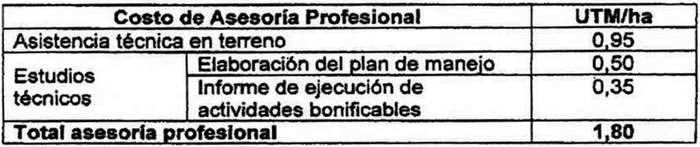 "3.- TABLA DE VALORES, QUE DETERMINA EL MONTO DE LA BONIFICACIÓN POR CONCEPTO DE ASESORÍA PROFESIONAL QUE ES NECESARIA PARA LA REALIZACIÓN DE LAS ACTIVIDADES BONIFICABLES A QUE SE REFIERE LA LEY N° 20.283, SOBRE RECUPERACIÓN DEL BOSQUE NATIVO Y FOMENTO FORESTAL.