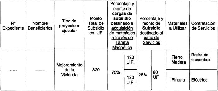 10. En caso que el proyecto sea aprobado, la resolución deberá detallar, de la forma que se señala en el cuadro modelo a continuación, al menos, el monto total del subsidio que corresponde a cada proyecto y familia; los porcentajes que correspondan para la adquisición de materiales y/o contratación de servicios de aquellas partidas de construcción que no serán ejecutadas por el beneficiario, y la distribución de las cargas del monto de subsidio que deberá considerar la tarjeta, según lo estipulado en el resuelvo 12. de la presente resolución.
