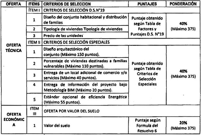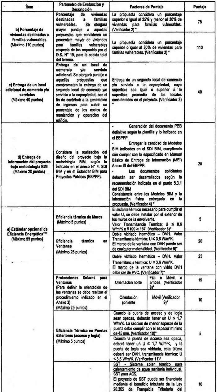 D.O. 23.10.2020 contenida en el artículo 11°, del DS N° 19, serán ponderados en un 40%. No se ponderarán en esta evaluación los puntajes correspondientes a los Ítems 1. Localización del Proyecto Habitacional y el Ítem 2. Contexto del Proyecto Habitacional, de la tabla señalada anteriormente, debido a que los lotes en que se emplazarán los proyectos propuestos se encuentran singularizados. Tampoco se ponderará el puntaje correspondiente al quinto factor de puntajes del Ítem 4, referido a los edificios que "presentan más de 3 y hasta 8 pisos". El puntaje final obtenido por cada una de las propuestas se calculará de acuerdo a la siguiente tabla: