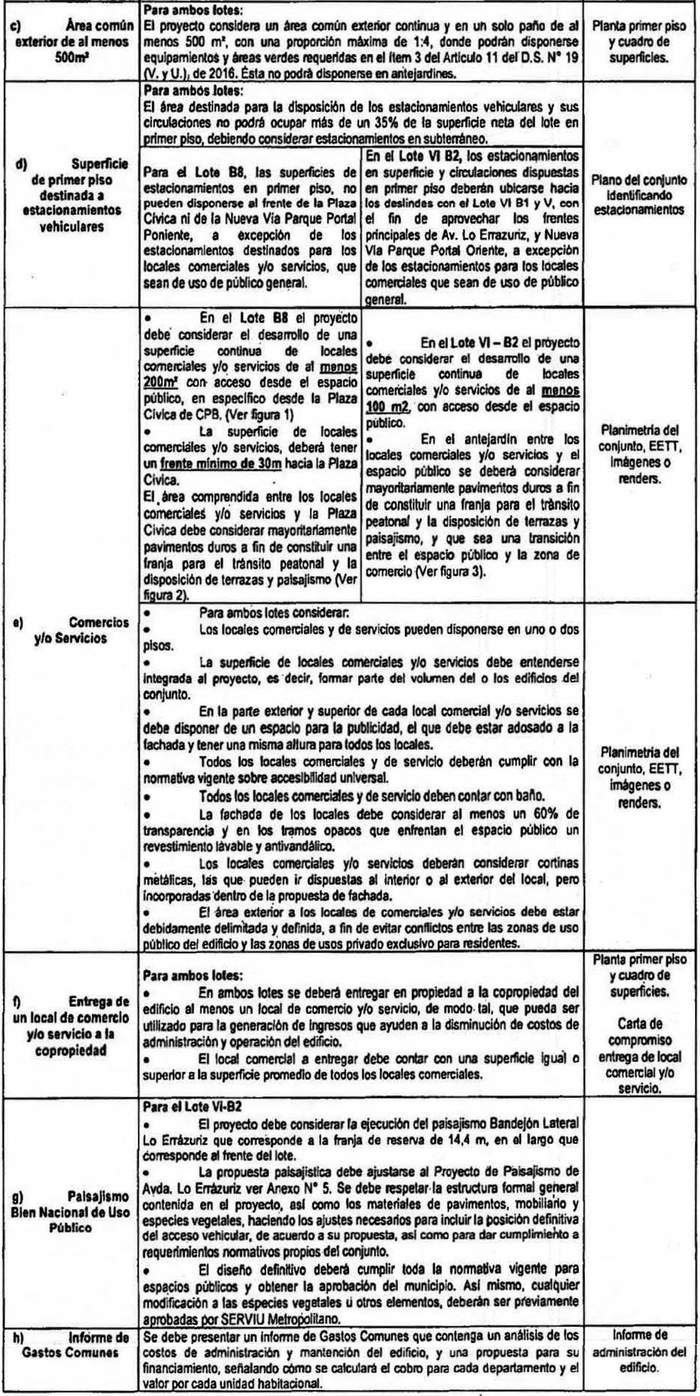 En cada uno de los lotes, se deberá desarrollar un proyecto en altura, considerando la normativa urbana que aplica en esta zona, junto con la entremezcla de las tipologías de viviendas establecida en el DS N° 19. En el caso del Lote B8, la propuesta arquitectónica del proyecto debe contribuir a consolidar la imagen urbana del Centro Cívico de CPB, dialogando con el carácter de este lugar, sus usos y potenciado su vinculación con la Plaza Cívica y el Parque Cerrillos.