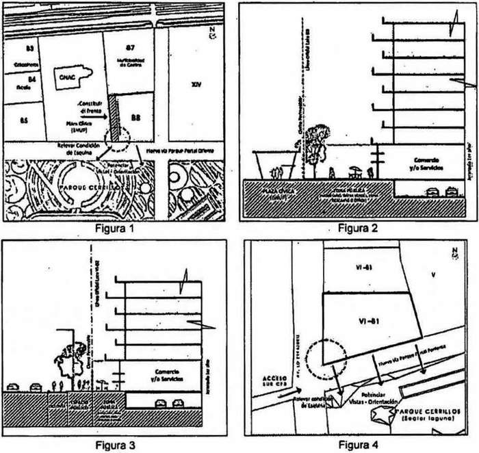 a) Para el Lote VI-B2, la propuesta arquitectónica debe considerar su condición de sitio esquina y de emplazamiento en frente de la Laguna del Parque Cerrillos, por ello, el proyecto debe tomar ventaja de su localización potenciando su vinculación con este espacio público y marcando el acceso sur a CPB.