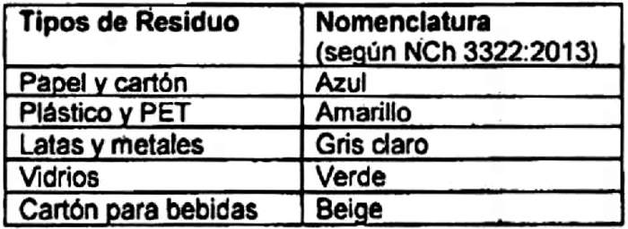 . Tanto closets ecológicos como contenedores, según sea el caso, deberán estar identificados mediante colores, según NCh 3322:2013. El resto de los residuos destinados a eliminación deberán ser almacenados en contenedores color gris oscuro.