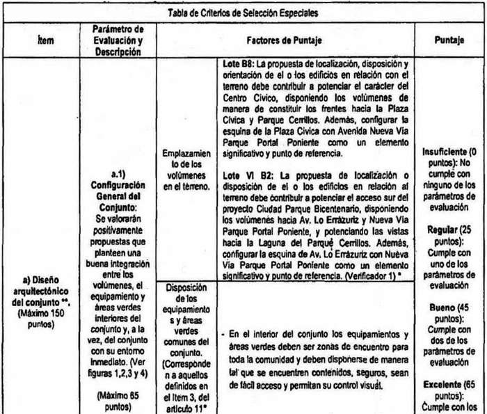** Para continuar con el proceso de evaluación la suma total de puntos en el ítem a) Diseño Arquitectónico del Conjunto, no puede ser inferior a 70 Puntos y ninguno de los puntos a.1), a.2), a.3) puede obtener un puntaje igual a 0.
