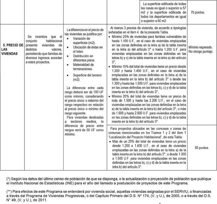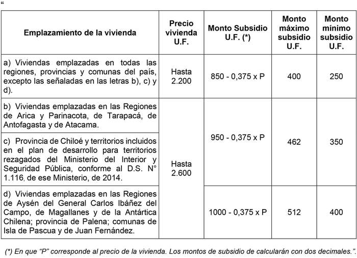 No obstante, mediante resolución fundada, el Ministro de Vivienda y Urbanismo podrá autorizar para estas zonas un precio de vivienda, para venta mediante la aplicación de un subsidio, de hasta 2.400 U.F., en el caso de viviendas emplazadas en las zonas definidas en la letra a) de la tabla inserta en la letra b) del artículo 3°, y de hasta 2.800 U.F. para viviendas emplazadas en las zonas definidas en las letras b), c) y d) de la tabla inserta en la letra b) del artículo 3°, cuyo monto de subsidio corresponderá a lo señalado en la tabla de la letra b) del artículo 3° del presente decreto, según corresponda la zona de emplazamiento de la vivienda.".