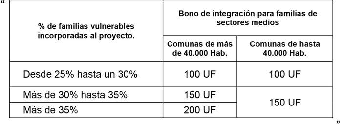 "El plazo para incorporar a las familias vulnerables y familias de sectores medios que adquieran viviendas entre las 1.200 y las 1.400 UF, en el caso de viviendas emplazadas en las zonas definidas en la letra a) de la tabla inserta en la letra b) del artículo 3°, o entre las 1.300 y las 1.500 U.F., para viviendas emplazadas en las zonas definidas en las letras b), c) y d) de la tabla inserta en la letra b) del artículo 3°, será hasta la fecha de recepción municipal del proyecto. Para obtener este bono se deberán respetar los porcentajes de integración social propuestos en la presentación del proyecto y sancionado mediante la resolución de selección de proyectos a que se refiere el artículo 13° del presente Reglamento.".