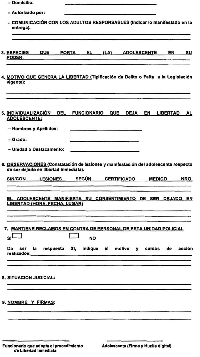 2. Se le consultará al ADOLESCENTE, su manifestación de voluntad, respecto de ser entregado a su adulto responsable o de ser dejado en libertad. En ambos casos se dejará constancia en el Libro de Guardia, además de realizar el Acta de Entrega de Adolescente a Adulto Responsable (Anexo Nº 1) o el Acta de Libertad Inmediata de Adolescente (Anexo Nº 2), consignando en ella lo que manifieste el adolescente, la que deberá ser firmada por éste y además consignar su huella digital.
