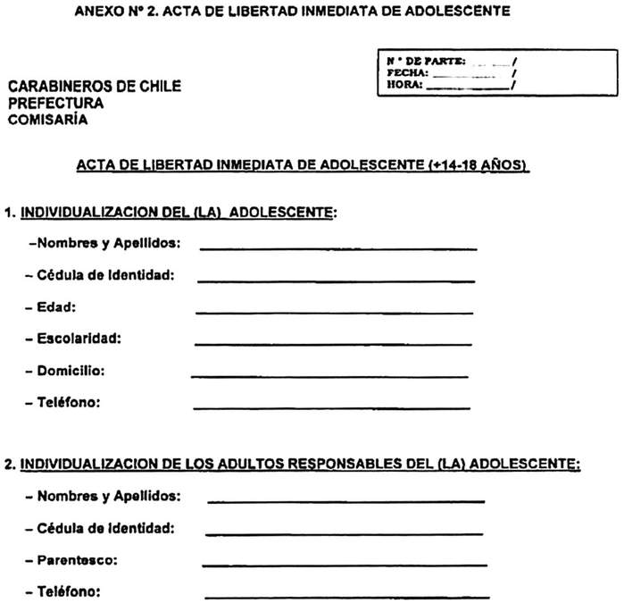 2.- Apruébase el Acta de Entrega de Adolescente a Adulto Responsable (Anexo Nº 1), y el Acta de Libertad Inmediata de Adolescente (Anexo Nº 2), que se adjuntan a la presente orden general.