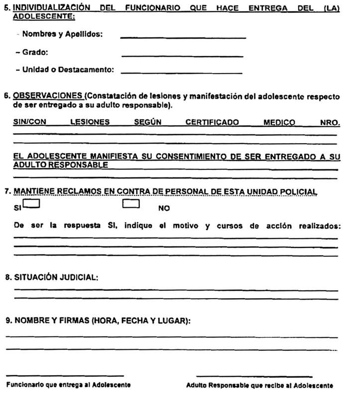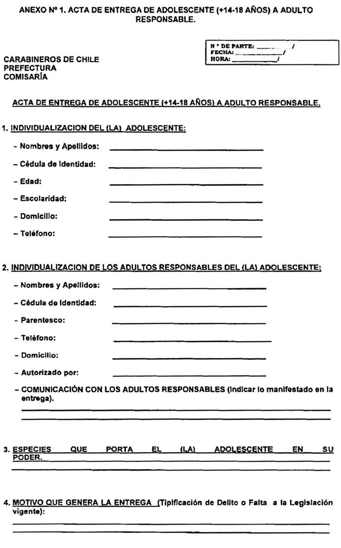 PROCEDIMIENTO POLICIAL PARA PROCEDER A DEJAR EN LIBERTAD O ENTREGAR A ADULTO RESPONSABLE A LOS ADOLESCENTES: MODIFICA ORDEN GENERAL, ESTABLECE DISPOSICIONES Y APRUEBA ACTAS QUE SE INDICAN