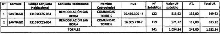1. Califícase de extrema relevancia y, en consecuencia, asígnense directamente 241 subsidios, regulados por el Programa de Mejoramiento de Viviendas y Barrios, regido por el DS N° 27 (V. y U.), de 2016, Capítulo Tercero, para Proyectos de Condominios de Viviendas, tipología de Proyecto de Mejoramiento de Bienes Comunes (Artículo 81, numeral 1, letra e), Obras en Fachadas y/o Muros, patrocinados por la PSAT de la IM de Santiago, a 2 copropiedades de la Remodelación San Borja, conforme a la nómina y montos que a continuación se detallan:
