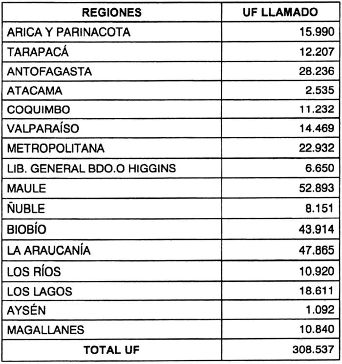 "4. El monto destinado para este llamado será de 308.537 UF y el número de proyectos seleccionados alcanzará hasta la cantidad de subsidios susceptibles de financiar con los recursos disponibles, incluidos los servicios de Asistencia Técnica que correspondan. La distribución regional de estos recursos es la siguiente:
