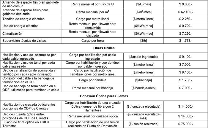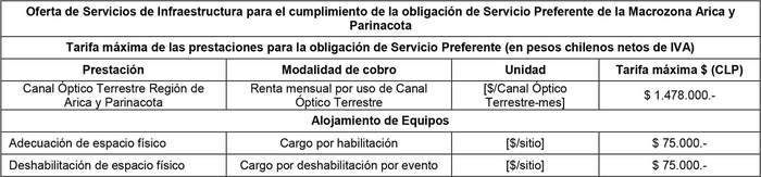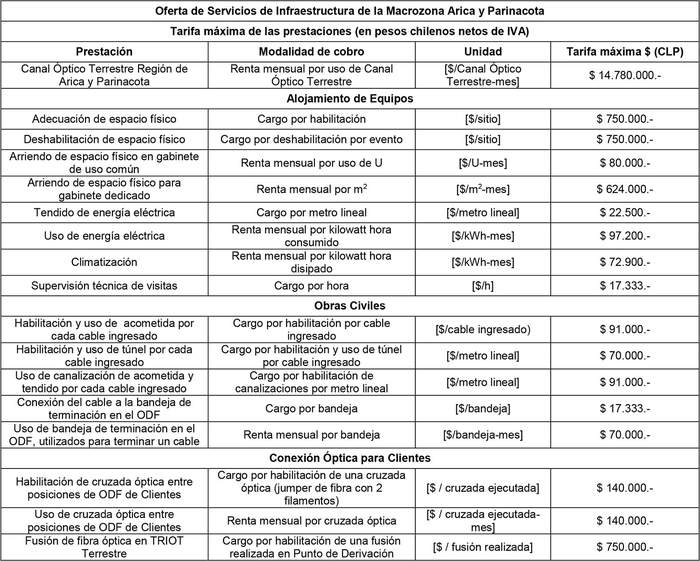 8.2 En el PIX, Puntos de Derivación y POIIT Terrestres comprometidos para la Macrozona Arica y Parinacota, se deberá hacer efectiva la Oferta de Servicios de Infraestructura, siendo sus respectivas prestaciones y tarifas máximas las siguientes:
