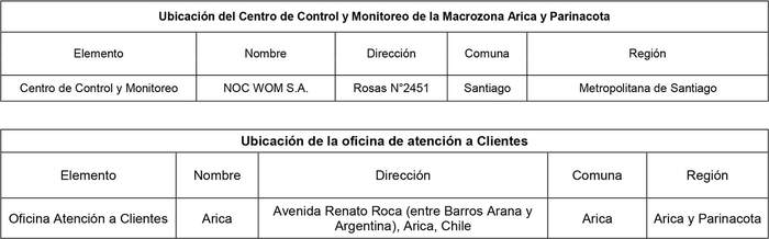 10. El Centro de Control y Monitoreo de la Infraestructura Óptica (NOC) de la Macrozona Arica y Parinacota corresponde al NOC de Wom S.A., ubicado en la ciudad de Santiago, Región Metropolitana de Santiago. En dicha locación se instalará y operará el equipamiento necesario para llevar a cabo el control, monitoreo y supervisión centralizados de todos los componentes y elementos que conforman a la Macrozona Arica y Parinacota. Se usará el COEOIT junto con los medios propios o de terceros debidamente autorizados que se requieren para el transporte de la información de monitoreo entre el PIX y los POIIT Terrestres de la Macrozona Arica y Parinacota, y el referido Centro de Control y Monitoreo de la Infraestructura Óptica. Asimismo, la concesionaria debe posibilitar el acceso remoto al sistema de monitoreo y supervisión de Macrozona Arica y Parinacota desde la oficina de atención a Clientes que será instalada en la comuna de Arica, la cual deberá contar con los elementos necesarios para efectuar pruebas y acceder a dicho sistema.