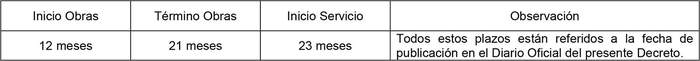 13. Los plazos de inicio y término de obras e inicio de servicio, son los que se indican a continuación: